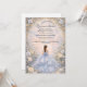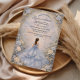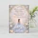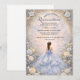 This elegant quinceañera design features a soft powder blue watercolor background framed by delicate ivory roses, subtle greenery, and ornate gold detailing, with a graceful gown illustration creating a refined, fairytale-inspired atmosphere. The cool blue palette paired with romantic florals gives the design a timeless, luxurious feel, perfect for a classic quinceañera celebration with an elegant garden aesthetic.
