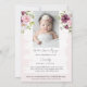 Sube la foto del bebé y los detalles de los logros en el reverso, ¡y envía invitaciones que son también recuerdos! ¡Da estilo al primer cumpleaños de tu bebé con elegantes detalles florales de acuarela! Vibraciones minimalistas modernas en blanco y negro con un toque de acento rosa suave. Este diseño versátil combina bien con temas de fiesta de té, fiesta de jardín, boho y shabby chic.