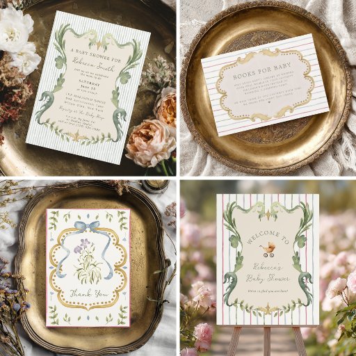 Celebrate the upcoming arrival of your little one with this Preppy Grandmillennial Botanical Frame Baby Shower Invitation. This timeless design combines preppy charm and classic elegance, featuring soft watercolor-style botanical illustrations arranged as a delicate frame around your event details. A subtle sage green striped background adds a polished, tailored touch, while whimsical calligraphy script brings warmth and personality. Designed in a gender-neutral color palette, it’s perfect for any celebration — whether you’re honoring a baby boy, girl, or keeping it a surprise. Fully customizable, this invitation is ideal for a garden party, afternoon tea, or traditional baby shower with a refined, grand millennial flair.