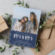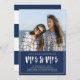 Invitación a una boda fotográfica para una boda lesbiana con una foto de las novias y mrs y mrs escritas con un gran cepillo sobre un fondo azul marino.