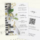 Invitación a la boda con un diseño moderno y elegante con guitarra y teclas de piano con notas musicales estilizadas en oro y rosas blancas frescas. Esta invitación tiene un área RSVP en la parte posterior con su propio código QR.