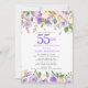 Honor a special woman with this elegant and feminine 55th Birthday party invitation. 55th is written in large purple text. Birthday celebration follows. The honored guest's name is also in purple capital letters. The birthday celebration details are surrounded top and bottom purple floral borders. The floral elements are nestled in deep green leaves. While it is a traditional design, the open and airy botanical foliage and text give it a contemporary vibe.