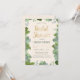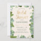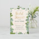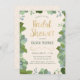 Esta invitación a la ducha de personalizable con novia cuenta con un borde ilustrado de flores verdes, grises y azules con un fondo de color crema (que se puede cambiar a tu gusto). El texto "Bridal Shower" está en oro (Relieve metalizado simulado), letra de escritura moderna. El nombre de la futura novia y los detalles del evento se pueden personalizar para su evento especial. El reverso es un color crema a juego (también cambiable) con un patrón de quatrefoil dorado superpuesto.