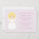 Primer Chica de la Santa Comunión. Este hermoso y elegante diseño de la Primera Comunión de una niña rubia que sostiene su primer rosario está en un dulce fondo lila. Aprecie los grandes recuerdos de la primera comunión sagrada de su hijo con este hermoso diseño. Echa un vistazo a los accesorios, papel y regalos de comunión de la Primera Comunión que coinciden.