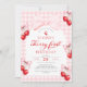Celebra el primer cumpleaños de tu pequeña con esta encantadora invitación con el hilo de coqueta "Cherry first". Con un delicioso tema de cerezo en forma de corazón, un elegante guión rojo y suaves acentos de color de agua, esta invitación es perfecta para una celebración de cumpleaños de primavera o verano con un tema de cerezas.