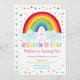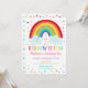 Esta encantadora invitación para el cumpleaños incluye un arcoíris colorido y nubes con confeti arcoiris y falsos acentos purpurinas de oro.
