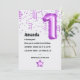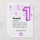 Invitación a la fiesta de cumpleaños del primer globo de número púrpura.