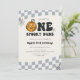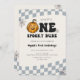 Dusty Blue Checker One Spooky Dude Pumpkin Invitación de cumpleaños