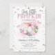 "Nuestra calabaza pequeña" invitaciones para el primer cumpleaños con un fondo blanco simple, una calabaza de acuarela rosa lindo, mariposas, flores, eucalipto, estrellas de oro y rosa, y una plantilla moderna para la celebración de cumpleaños que es fácil de personalizar.