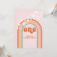 Invitación de primer cumpleaños inspirada en el retro con estilo hippie arcoiris, daisies y fuentes boho y colores.