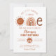 Una moderna invitación rústica de boho por primera cumpleaños con arcoiris color tierra terracota y elementos de sol.