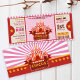 Invite a todo el mundo a la gran carpa para una fiesta de cumpleaños espectacular en el circo con nuestras plantillas de invitación para los pasajes de circo rosa. Las invitaciones para el cumpleaños de este circo incluyen una tienda de circo rojo con carteles de luz brillantes en un estilo vintage marrón pálido que admite un diseño de boletos. El tema de color es totalmente editable. pulse personalizar para cambiar el color de fondo. Diseñar reverso a una tienda de circo personalizable con el nombre de su pequeño en un color de fondo editable. Ahora, ven uno, ven todos, ¡sube hasta el mayor fiesta de circo del mundo!