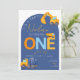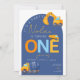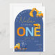 Invitación a la construcción para el primer cumpleaños con camiones de construcción con pop de naranja, azul y amarillo.