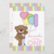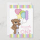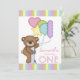 Una dulce invitación para el primer cumpleaños de un chica con un lindo ilustracion de un oso sosteniendo un número uno y globos. Las formas del globo incluyen un corazón de amor, una estrella y círculos en rosa, amarillo, verde, azul y violeta. En la parte superior e inferior de la invitación se encuentra un entretenido borde de colores arcoiris pastel a juego con los colores de los globos. Personalizar el texto para crear las invitaciones más dulces para el primer fiesta de cumpleaños de tu bebé. Si necesita ayuda para su personalización, póngase en contacto con nosotros a través de nuestra tienda de regalos Bonanza. Este diseño se creó en parte con gráficos comprados con una licencia comercial de www.realdealclipart.com