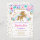 Primera invitación fiesta de cumpleaños del unicornio. Diseño lindo en oro falso con purpurina y flores. Invitación con la silueta de un unicornio con purpurina, arco iris, estrellas y el texto. Púrpura, rosa lavanda y blanco. Perfecta para una 1ra celebración.