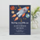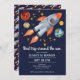 Una invitación a la fiesta de primer cumpleaños con tema de acuarela que se puede personalizar con la inclusión de los detalles del fiesta de tu pequeño. Estas invitaciones espaciales harán que la fiesta de cumpleaños de tu pequeña comience con estilo porque son lindas, divertidas y cuentan con un barco con cohetes, estrellas, una galaxia y planetas. Lo mismo para una fiesta de cumpleaños fuera de este mundo.