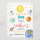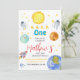 Una invitación de primer cumpleaños con temática espacial adorable que incluye un bonito sol, planetas, cohetes, astronautas y diseño de cuenta regresiva. Perfecto para celebrar el primer viaje de su pequeño por el sol con una divertida y colorida temática cósmica fiesta.