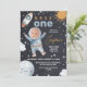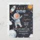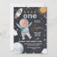 Primer viaje por el espacio negro alrededor del sol Invitación al primer cumpleaños Cute la invitación de un niño al espacio exterior con tema de primer cumpleaños que incluye una nave espacial, varias estrellas, planeta y sol, así como un astronauta con una foto dentro del casco espacial. Este primer viaje alrededor de la invitación para el cumpleaños del sol es una forma muy agradable de invitar a los huéspedes a una fiesta de primer cumpleaños con temática de espacio exterior.