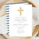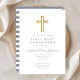 Invitación a la Primera Comunión del personalizado Modern Blue Cross Boy. Parte de la suite Dusty Blue Script Cross Boy First Communion Suite con papel y accesorios para el primer fiesta de comunión.