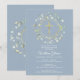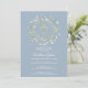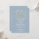 Un festón de vegetación decorativo y una cruz dorada se encuentran sobre la información de su invitación especial para la primera comunión sobre un fondo azul polvo.