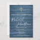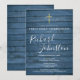 Una invitación rústica para la primera comunión que presenta una elegante cruz dorada y el nombre en letra script sobre un fondo de paneles de madera azul. Personalice con la información de su evento especial en tipografía chic. Diseñado por Thisisnotme©