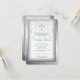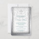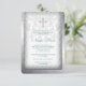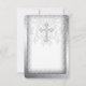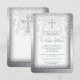 Invitación de primera comunión elegante con remolinos de damasco gris plateado y blanco con cruz de perla blanca. Esta bonita invitación de primera comunión con damasco blanco se personaliza fácilmente para su evento agregando los detalles del evento, estilo de fuente, tamaño y color de la letra, y redacción.