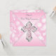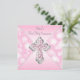 Invitación de Primera Comunión rosa para niñas con elegante cruz de diamantes rosa y plata sobre un hermoso fondo rosa y blanco. Puede personalizar fácilmente esta bonita invitación de Primera Comunión rosa agregando los detalles de su evento en el tamaño y color de fuente, y la redacción de su elección. También puede cambiar el color de fondo.
