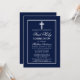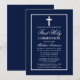 Elegante Invitación Azul Marino Primera Comunión con Cruz. Marco Blanco.