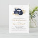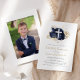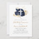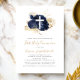 Esta elegante primera invitación a la comunión presenta una cruz blanca sobre un fondo de flores azul marino, ambientada por un delicado Relieve metalizado de imitación de oro y follaje purpurina. El texto del personalizable combina el guión de escritura a mano de color dorado y el tipo de letra de copperplate gris de carbón en un fondo blanco. Reemplace fácilmente la imagen de muestra en la parte de atrás con una foto vertical del invitado de honor.