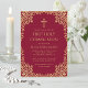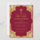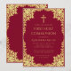 Esta elegante invitación de primera comunión de color burdeos y dorado con aire vintage, recomendada para niña, tiene un marco ornamentado de falso foil dorado con ramas serpenteantes con hojas doradas sobre fondo burdeos. Sobre el texto hay una cruz religiosa en falso foil dorado. Todo el texto se puede personalizar y tiene un color amarillo dorado similar al marco de falso oro.