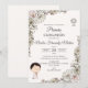Invitar a los seres queridos a la Primera Comunión Sagrada de su hijo con esta invitación resaltada con flores rosas, un niño y un cáliz. ¡Un toque lindo para tu celebración de la Primera Comunión! Español / Español: Celebra la Primera Comunion de tu hija con esta invitación.