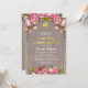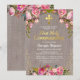 Invitación de primera comunión para niñas que presenta un fondo de madera rústica, purpurina dorada dispersa, una hermosa exhibición floral de acuarela rosa, un título de foil dorado con letra cursiva, una cruz religiosa y una plantilla de comunión sagrada que es fácil de personalizar.