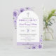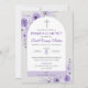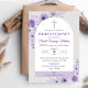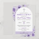 Invite a tus seres queridos a una Primera Comunión especial con esta elegante invitación, que presenta flores moradas y una cruz linda. Este diseño religioso es perfecto para celebraciones católicas.
