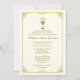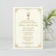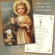 Con una hermosa invitación de un personalizado diseñado para la Primera Comunión, con una hermosa imagen del Niño Jesús con un ramo de flores. La Eucaristía Santa está situada en el lado derecho. En el reverso de la invitación hay un cáliz dorado y un anfitrión que enfatiza lo sagrado de esta alegre ocasión.