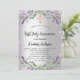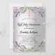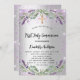 Una invitación moderna, elegante y glamorosa a una Primera Santa Comunión. Un fondo falso plateado con purpurina falso violeta, chispas, flores de lavanda, flores y vegetación eucalipta. El nombre está escrito con una escritura de estilo con letras a mano moderna. Personalice y agregue sus detalles.