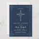 Esta elegante y clásica primera invitación a la comunión sagrada presenta una cruz blanca dibujada con un borde detallado que se corresponde. El ejemplo se muestra en azul marino, pero el color de fondo se puede personalizar a su gusto. Perfecto para su ocasión religiosa especial, el texto también puede ser personalizado para su evento.