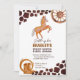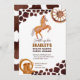 Descarga instantánea de la plantilla de invitación a la fiesta de cumpleaños de caballo por primera vez en rodeo occidental. Caballo de bebé palomino marrón, rueda, botas de cuerda y vaquero, patrón de vaca, fuente vintage occidental y escritura de pincel moderno.