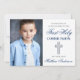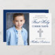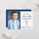 Elegante invitación a la Santa Comunión con cruz y foto en azul y plata.