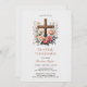 Honre la bendita ocasión de la Primera Comunión Santa de su bebé con esta elegante y tradicional invitación. Esta tarjeta personalizada es perfecta para celebrar el día especial de su hija, con una cruz bellamente diseñada y rodeada de suaves flores color rosa y crema. Centrada en la fe católica y cristiana, esta invitación proporciona todos los detalles importantes del evento, incluyendo la ceremonia de la iglesia y la recepción. Es perfecto para las familias que buscan una manera significativa y atemporal de anunciar este hito religioso con sus seres queridos.