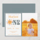 Primera vuelta alrededor del sol invitación de primer cumpleaños. Tema de fiesta de cumpleaños 1er género neutral niño o niña. Gráficos de Sol brillantes y lindos con tonos terrosos. Conjunto de decoración de fiesta a juego con fondo claro y fuente nítida, pasteles verdes, amarillos, azules y naranjas