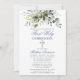 La moderna y elegante invitación a la Primera Santa Comunión incluye hojas de eucalipto acuarela y otros hermosos follajes de vegetación botánica. Cruz de Plata. Dusty Blue Back.