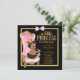Invitación a una ducha de bebé rosa, negro y dorado con una adorable princesa africana de etnia americana que usa un tutu frito y una cuerda de perlas sentadas en una elegante silla rosa y dorada sobre un elegante fondo negro y dorado. Puede cambiar el color de fondo, eliminar el arco y agregar los detalles del evento en el estilo de fuente, color y texto de su elección. Se trata de un diseño impreso sin purpurina, joyas, arcos, etc.