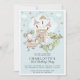 Un mágico reino de castillo de acuarela con princesa y dragón, chica de oro azul, invitación a la fiesta de primer cumpleaños con un borde blanco. Whimsical, mágico y lindo, para un niño pequeño.