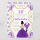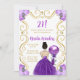 La invitación a la fiesta de cumpleaños incluye un marco dorado elegante, una bella princesa con el pelo castaño y un vestido morado, flores y un globo. Esto es perfecto para una fiesta de cumpleaños.