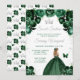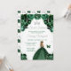 Esta elegante y glamurosa invitación de cumpleaños para dulces dieciséis presenta a una hermosa princesa con cabello rubio en un vestido de gala verde oscuro. El texto combina letra manuscrita y fuentes modernas sans serif para un aspecto clásico y sofisticado. Los arreglos florales, la mariposa y el confeti plateado crean la combinación perfecta de rústico y chic.