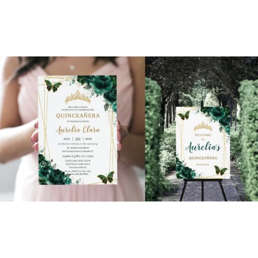 Invitación Princesa de oro floral verde esmeralda de Quinceañ