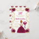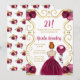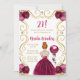 La invitación a la fiesta de cumpleaños incluye un marco dorado elegante, una bella princesa con el pelo rojo y un vestido rojo borgoña, flores y un globo. Esto es perfecto para una fiesta de cumpleaños.
