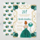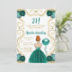La invitación a la fiesta de cumpleaños incluye un marco dorado elegante, una bella princesa con el pelo rojo y un verde azulado vestido azul, flores y un globo. Esto es perfecto para una fiesta de cumpleaños.