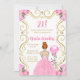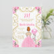 La invitación a la fiesta de cumpleaños incluye un marco dorado elegante, una bella princesa con el pelo rojo y un vestido rosa, flores y un globo. Esto es perfecto para una fiesta de cumpleaños.