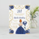 La invitación a la fiesta de cumpleaños incluye un marco dorado elegante, una bella princesa con el pelo rojo y un vestido azul marino, flores y un globo. Esto es perfecto para una fiesta de cumpleaños.